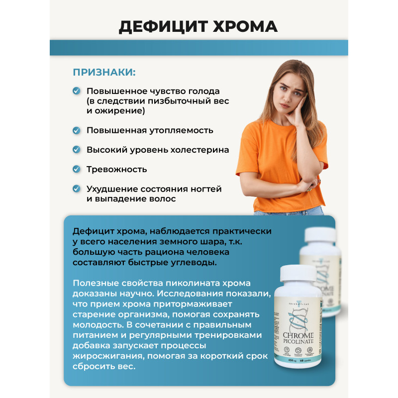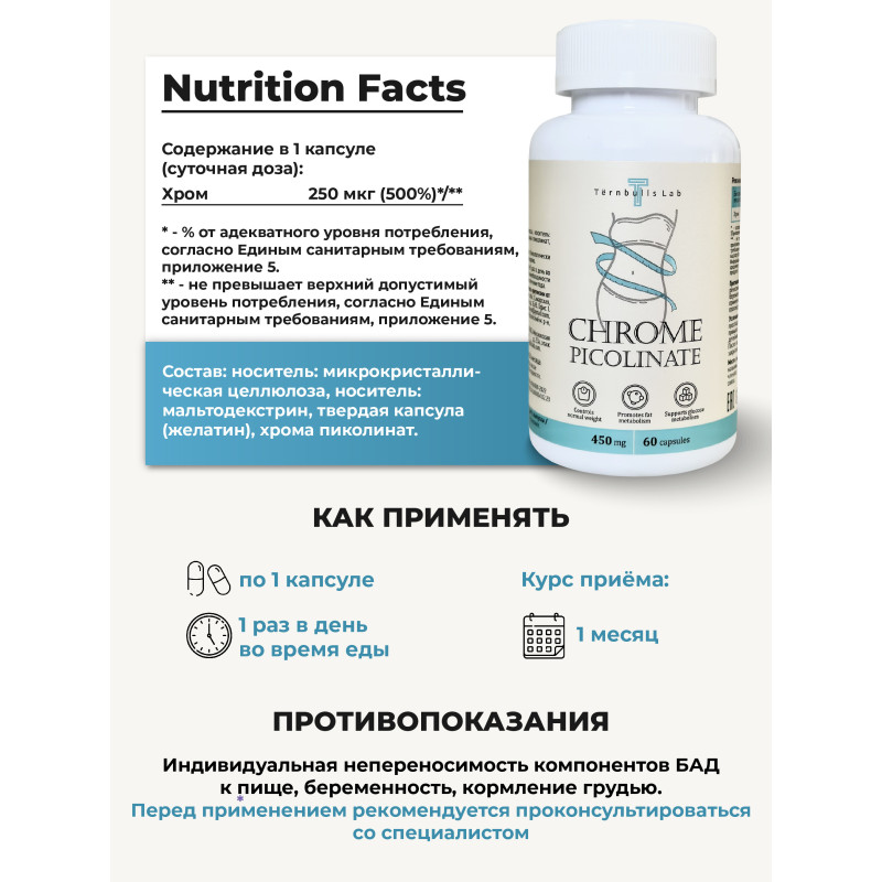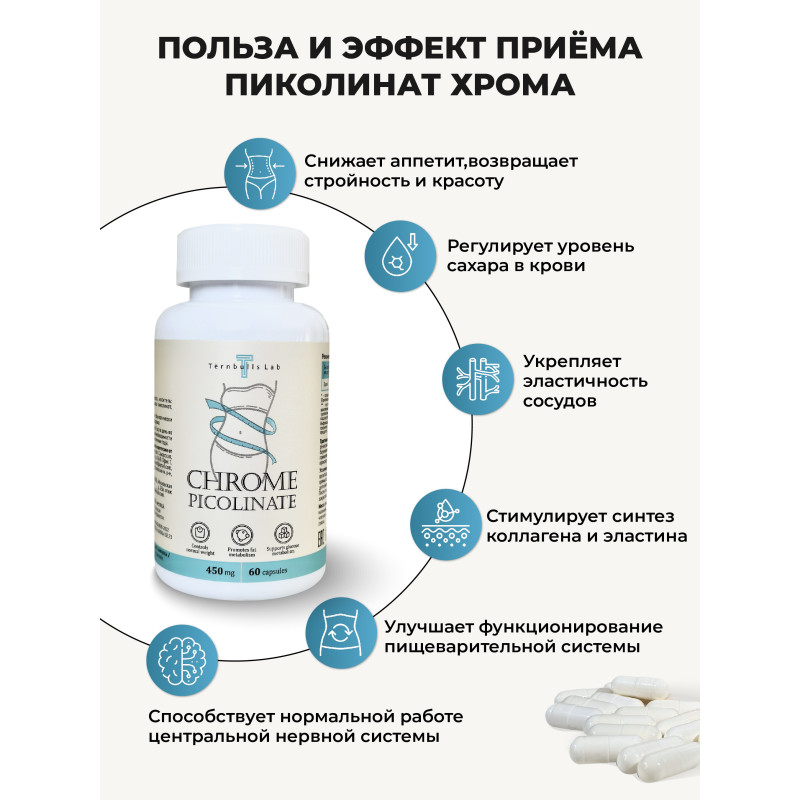 Хром пиколинат – легкоусвояемая форма хрома, принимает участие в регуляции углеводного и жирового обмена. Улучшает углеводный обмен, повышает чувствительность клеток к инсулину. Способствует снижению уровня сахара в крови, уменьшая образование жира. Ослабляет чувство голода и тягу к сладкому. Положительно влияет на работу щитовидной железы, позволяя нормализовать выработку ее гормонов. Ускоряет жировой обмен, способствуя сжиганию жиров и снижению лишнего веса. В отличие от хрома хелат улучшает эмоциональное состояние, снижая тревожность и помогая легче справляться со стрессом. Рекомендации по применению: взрослым по 1 капсуле в день во время еды. Продолжительность приема: 1 месяц. Состав: носитель: микрокристаллическая целлюлоза, носитель: мальтодекстрин, твердая капсула (желатин), хрома пиколинат, стабилизатор: диоксид кремния или без него.