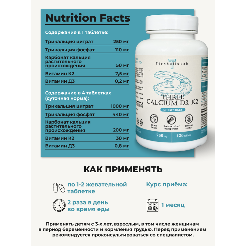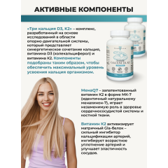 Биологически активная добавка невероятно полезна для женского и мужского организма, отличается уникальным составом. В ней содержится витамин D3, кальция цитрат, фосфат кальция, карбонат кальция, диоксид кремния и витамин К2 в форме менахинона. Препарат поддерживает сердечный ритм в норме, снижает вероятность судорог и нервной возбудимости. Комплекс улучшает состояние кожи, стимулирует рост волос при выпадении, укрепляет кровеносные сосуды, в т.ч. головного мозга. Это комплексное пищевое средство для укрепления иммунитета, внимания и памяти, восстановления организма после физических нагрузок, для выносливости, контроля над весом при похудении без медицинских лекарств и таблеток. Подобранные компоненты комплекса неразрывно связаны между собой: Витамин Д3 отвечает за всасывание кальция кишечником в полном объеме и усиливает степень усваивания этого микроэлемента. Витамин K2 активирует специальный белок (остеокальцин), отвечающий за накопление кальция в костной ткани и зубах. Кроме того, витамин транспортирует кальций в те участки тела, где элемент особенно необходим. Также Витамин К2 улучшает всасывание и усваивание Витамина Д3. В итоге элементы пищевой добавки работают «в тандеме», усиливая действие друг друга. Рекомендуем принимать по 2 жевательные таблетки 2 раза в день во врем еды. Таблетки имеют натуральный аромат клубники.