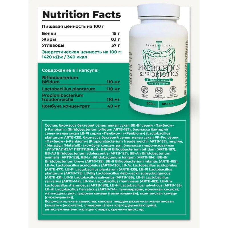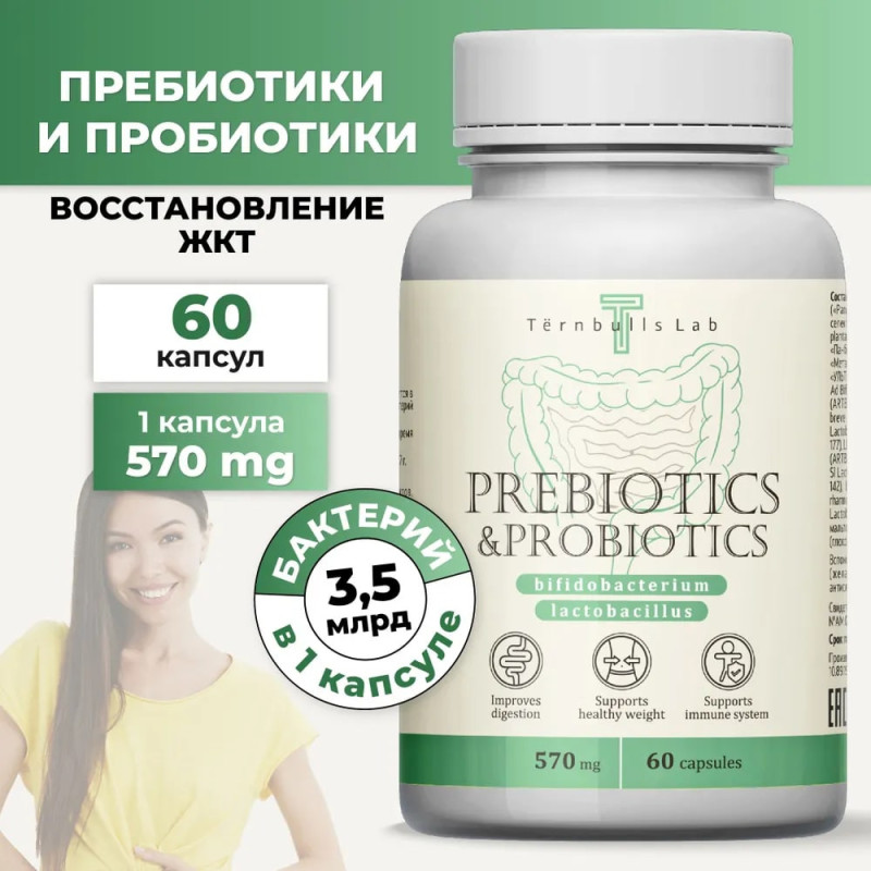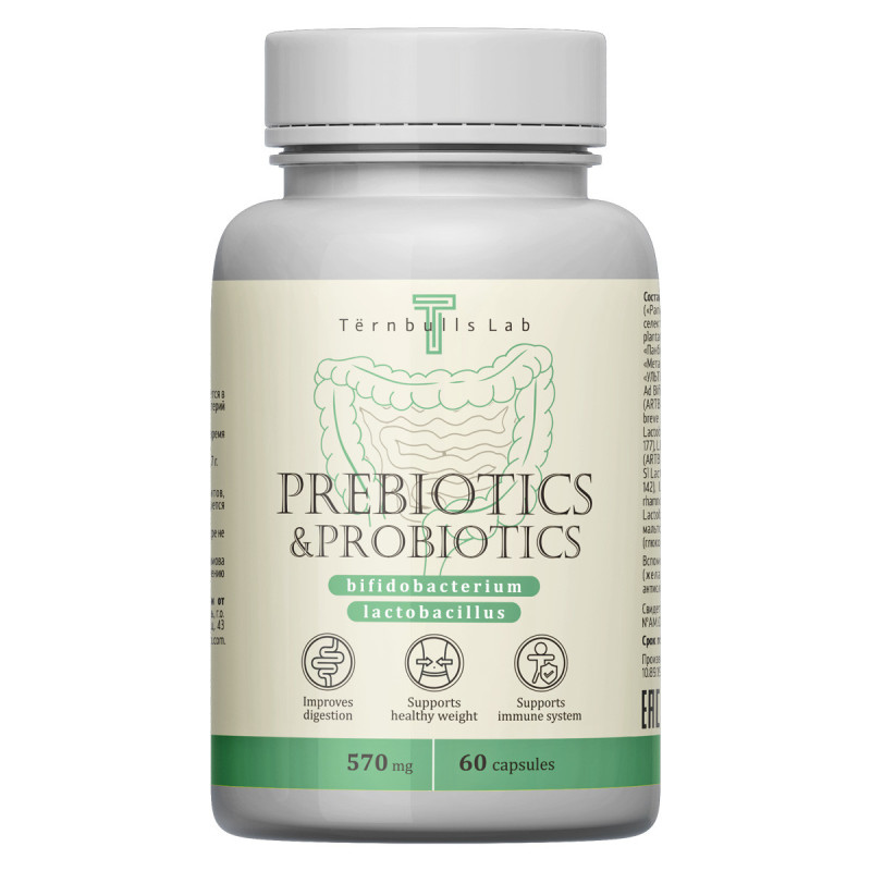 Prebiotics и Probiotics от Tёrnbulls Lab это комплекс пробиотиков и пребиотиков, необходимый для здоровой работы ЖКТ и правильного усвоения питательных веществ. Нормализует микрофлору кишечника, восстанавливает все процессы пищеварения и способствует заживлению язв и воспалений.