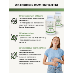 Поддерживает нормальную микрофлору кишечника, улучшает процессы пищеварения, восстанавливает нормальный метаболизм. Содержит витамины группы (В1, В2, В6), лактазу, липазу, лактулозу и специально подобранные семь пробиотических штаммов. В одной капсуле содержится 2,4 млрд бактерий. Комплекс вызывает положительную динамику показателей пищеварения и восстанавливает нормальный состав кишечной микрофлоры. К пользе пробиотиков Вы можете добавить пребиотики, молочные микроорганизмы, витамин С. Благодаря сбалансированному составу и живым бактериям, комплекс мягко воздействует на ЖКТ, устраняя дисбактериоз, вздутие, раздражение и другие последствия нарушения микрофлоры. Bifidobacterium (культура) в составе препятствует развитию патогенных бактерий, Streptococcus (культура) помогает правильному усвоению питательных веществ и контролю аппетита. Витамины B 1 2 6 оказывают дополнительное поддерживающее действие и являются питательной средой для полезных бактерий. Витамин B1 (Тиамин) поддерживает деятельность сердечно-сосудистой и мышечной систем. В2 (Рибофлавин) это здоровье для ногтей и необходимый витамин для волос от выпадения. B6 (Пиридоксин) восстанавливает нервную систему, незаменим для кожи лица. В состав комплекса входят ферменты для пищеварения, лактобактерии и бифидобактерии штаммов АС-1579, В-2353, В-9653, которые препятствуют развитию болезнетворных бактерий, синтезируют комплекс витаминов группы b, что очень полезно для кишечника.