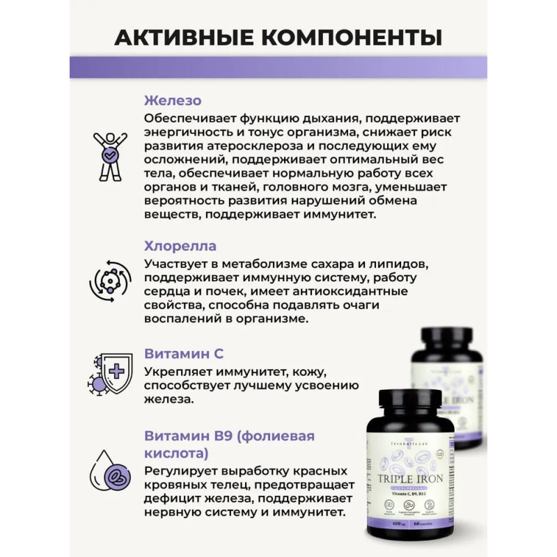 БАД применяется для восстановления поддержания в норме уровня ферритина и гемоглобина, улучшает кроветворение, работу иммунной и нервной систем, при недостатке и повышенной потребности в железе. В данном витаминном комплексе микроэлемент представлен в форме бесглицината. Это форма железа, биодоступность которой приближается к 90–100%. В отличии от солей железа двухвалентного и гидроксида железа трёхвалентного (препараты 1-го и 2-го поколения), бесглицинат железа характеризуется отличной переносимостью. Железо в форме хелата не раздражает слизистую оболочку желудка, не вызывает запоры и тошноту, не окрашивает эмаль зубов, не нарушает всасывание других минералов и питательных веществ, а также в процессе его приёма отсутствует металлический привкус во рту. Входящий в состав витамин С улучшает биодоступность компонентов. Витамин С это транспортировка компонентов железа, защита организма от вирусов и простуд, сильный иммунитет и хорошее настроение. Порошок Хлореллы — источник органического железа (бисглицината). Оказывает выраженное детоксицирующее, противовоспалительное, антибактериальное, противовирусное действие, нормализующее уровень глюкозы в крови. Клеточный сок пихты сибирской содержит каротин, мальтол и целый ряд полезных микроэлементов. Мальтол это сильнейший природный антиоксидант, не дающий свободным радикалам разрушать клетки организма. Улучшает всасываемость и усвоение железа. Фолиевая кислота (витамин В9) поставляет углерод для синтеза железосодержащего протеина в гемоглобине. Вместе с витамином В12 участвует в процессе кроветворения. Укрепляет стенки сосудов и капилляров. Витамин В12 поддерживает метаболизм во всех клетках организма, нормализует работу ЦНС, обеспечивают организм энергией и повышают выносливость. Улучшают сон и концентрацию внимания.