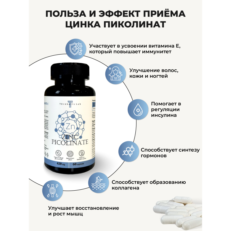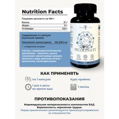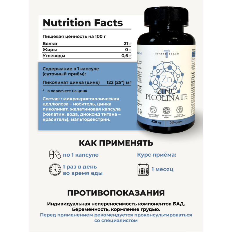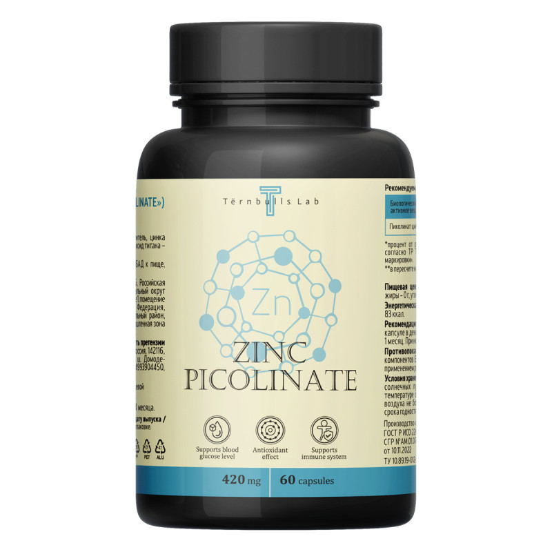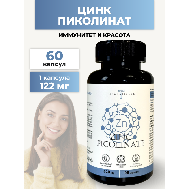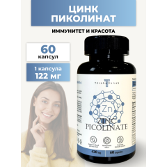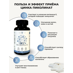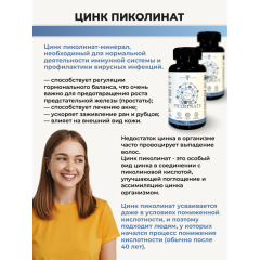 Человеческий организм содержит до 2 г цинка в разных формах соединений. Этот минерал в основном концентрируется в поджелудочной железе, печени, простате и мышцах. А также входит в состав более чем 400 разных ферментов, запускающих десятки реакций обмена веществ и процесса дыхания, превращения и выведения углекислого газа. Он обладает ранозаживляющими и антибактериальными свойствами, благодаря чему эффективно поддерживает здоровье кожи, регулирует деятельность сальных желез, активно участвует в регенерации кожи и способствует скорейшему заживлению ран. Достаточный уровень цинка необходим для поддержания здоровья репродуктивной системы женщин и мужчин и нормальной выработки в организме тестостерона. В одной капсуле содержится 122 мг пиколината цинка (что составляет 167% от среднесуточной потребности человека). Рекомендации по применению: принимать по 1 капсуле 1 раз в день вместе с приёмом пищи. Продолжительность приема - 1 месяц. При необходимости приём можно повторить. Возможны повторные приемы в течение года. Противопоказания: индивидуальная непереносимость компонентов БАД, беременность, кормление грудью. Перед применением рекомендуется проконсультироваться с врачом. Перед применением БАД детьми необходимо проконсультироваться с врачом-педиатром. Состав: микрокристаллическая целлюлоза - носитель, цинка пиколинат, желатиновая капсула (желатин, вода, диоксид титана - носитель), мальтодекстрин.